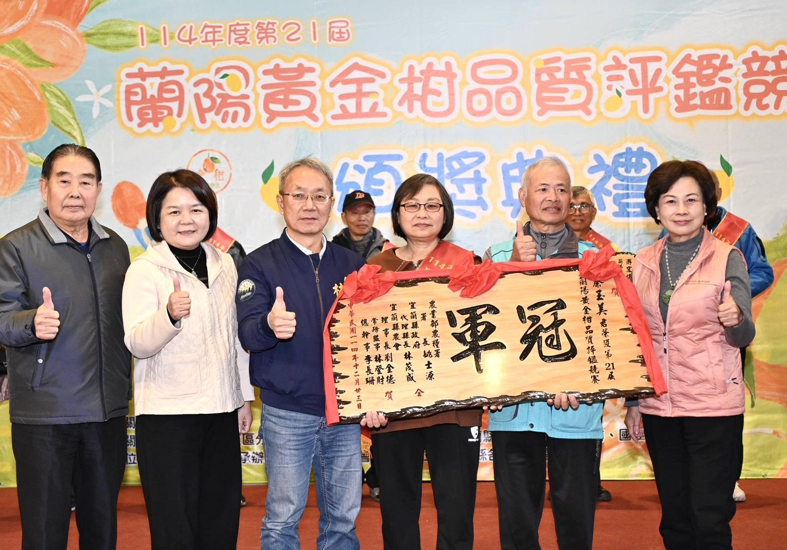 代理縣長林茂盛表示,每逢歲末年節即是宜蘭金柑盛產季節,全縣金柑種植面積約194公頃,年產量約2,000公噸。透過品質評鑑與產地分級制度,不僅協助農友精進栽培管理,也讓消費市場能清楚辨識高品質的宜蘭金柑。今年金柑生產過程歷經多次天候挑戰,得獎果農仍能培育出兼具糖度、風味與外觀的優質果品,實屬不易,呼籲民眾多加選購在地金柑,以實際行動支持辛苦的果農。