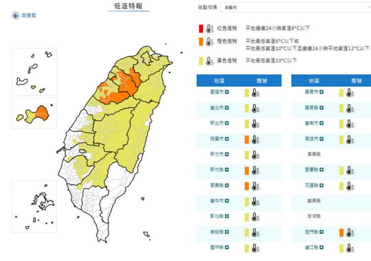 非常寒冷的地區有:桃園、新竹縣、苗栗、金門等縣市有6度以下發生的機率;寒冷地區有:新北、基隆、臺北、新竹、臺中、彰化、南投、雲林、嘉義市、嘉義縣、臺南、高雄、宜蘭、花蓮等縣市有10度以下發生的機率,連江縣亦有6度以下低溫發生的機率。請注意保暖。