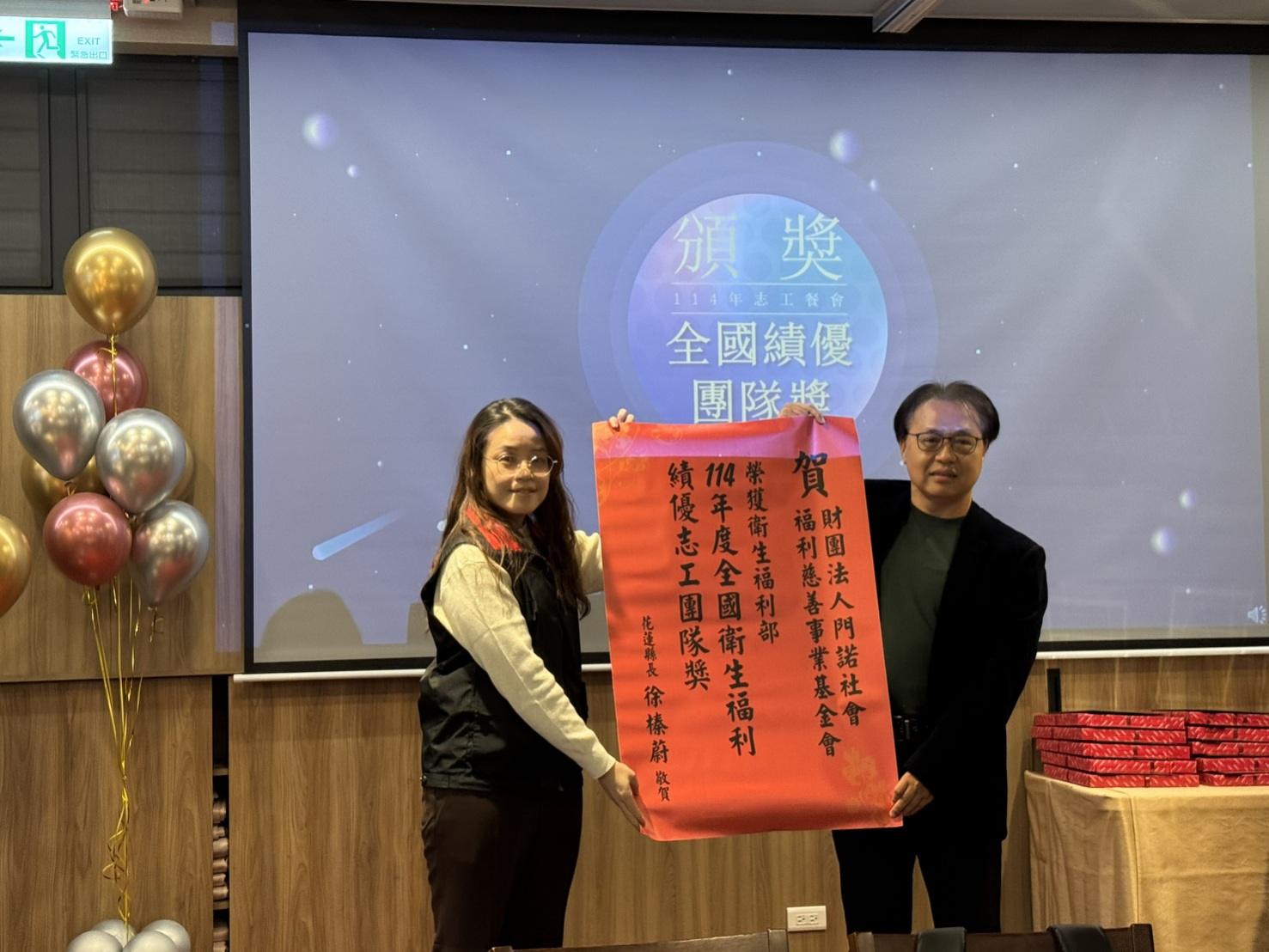 門諾基金會是花蓮縣唯一獲得衛生福利部表揚的「114年全國衛生福利績優志工團隊獎」,也在餐會中接受表揚。花蓮縣政府社會處行政科長黃姿華代表頒贈紅榜,由門諾基金會董事長周朝國接受,肯定基金會與花蓮縣政府攜手推動祥和志工計畫29年來,持續深耕社區、穩定服務在地的努力與成果。