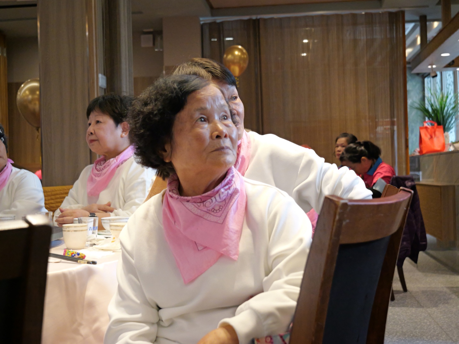 ▲榮獲「菁英志工20年獎」的鍾五妹觀賞年度服務回顧影片,神情專注。