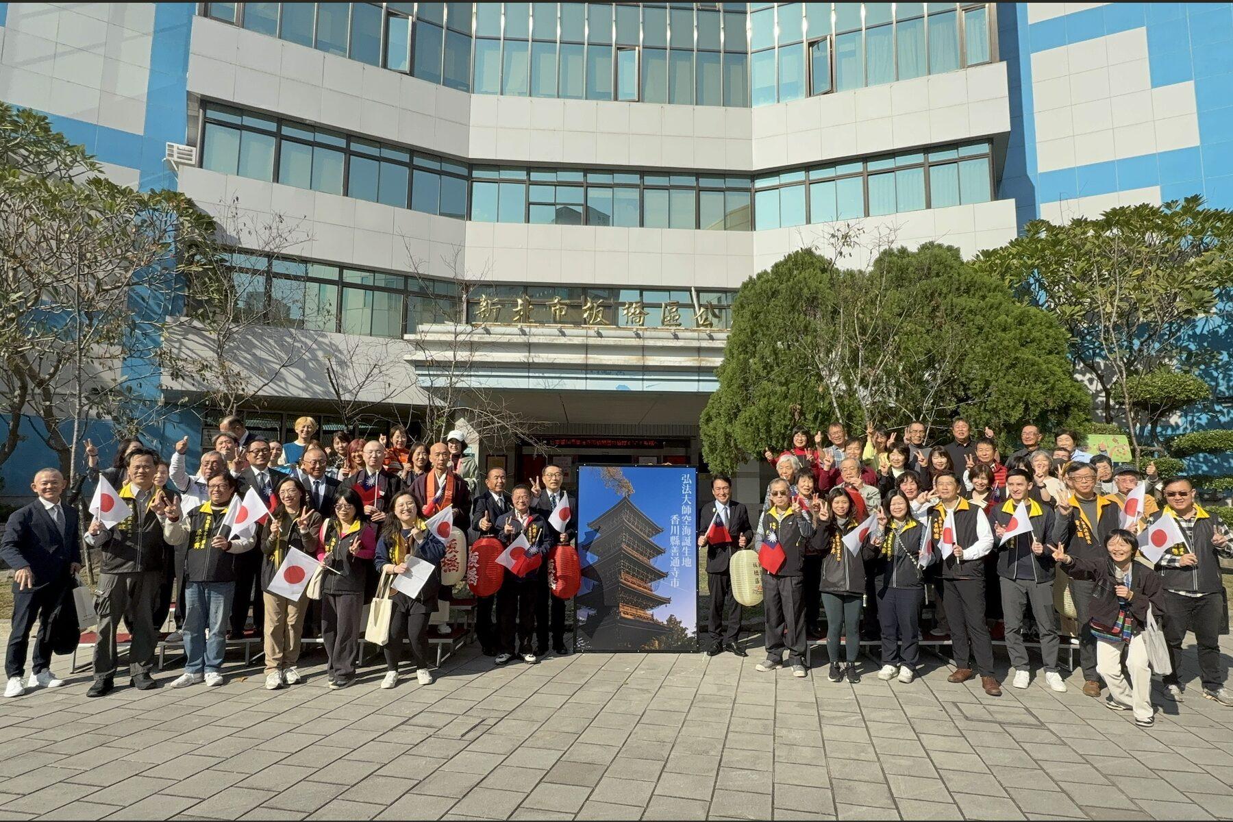 日本香川縣善通寺市市長辻村修(13)日帶領市府團隊及市民一行45人蒞臨板橋區進行交流參訪,公所邀請地方社團以「鳳陽花鼓」傳統民俗舞蹈揭開迎賓序幕,並參訪慈濟板橋園區、林家花園,辻村修市長也帶來「善通寺五重塔」形象特色燈籠,將於2月20日「2026新北燈會」展出,增添燈會日式風情。