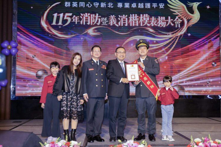 侯友宜一一頒獎感謝獲獎的消防與義消人員,其中安康義消分隊隊員倪隆冠與妻子一起投入義消服務長達17年,獲頒楷模獎座實至名歸。侯友宜表示,每一位楷模背後都有一段可敬的經歷,他們為了守護市民全力以赴的精神是大家學習的典範。