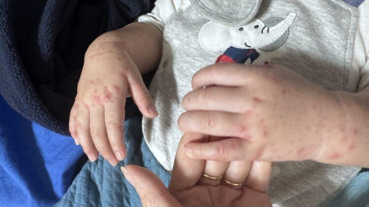 ▲疫情延燒至家庭成員,1歲4個月大的男嬰手腳均有水泡、紅腫潰爛,令人不捨。(圖/家長提供)