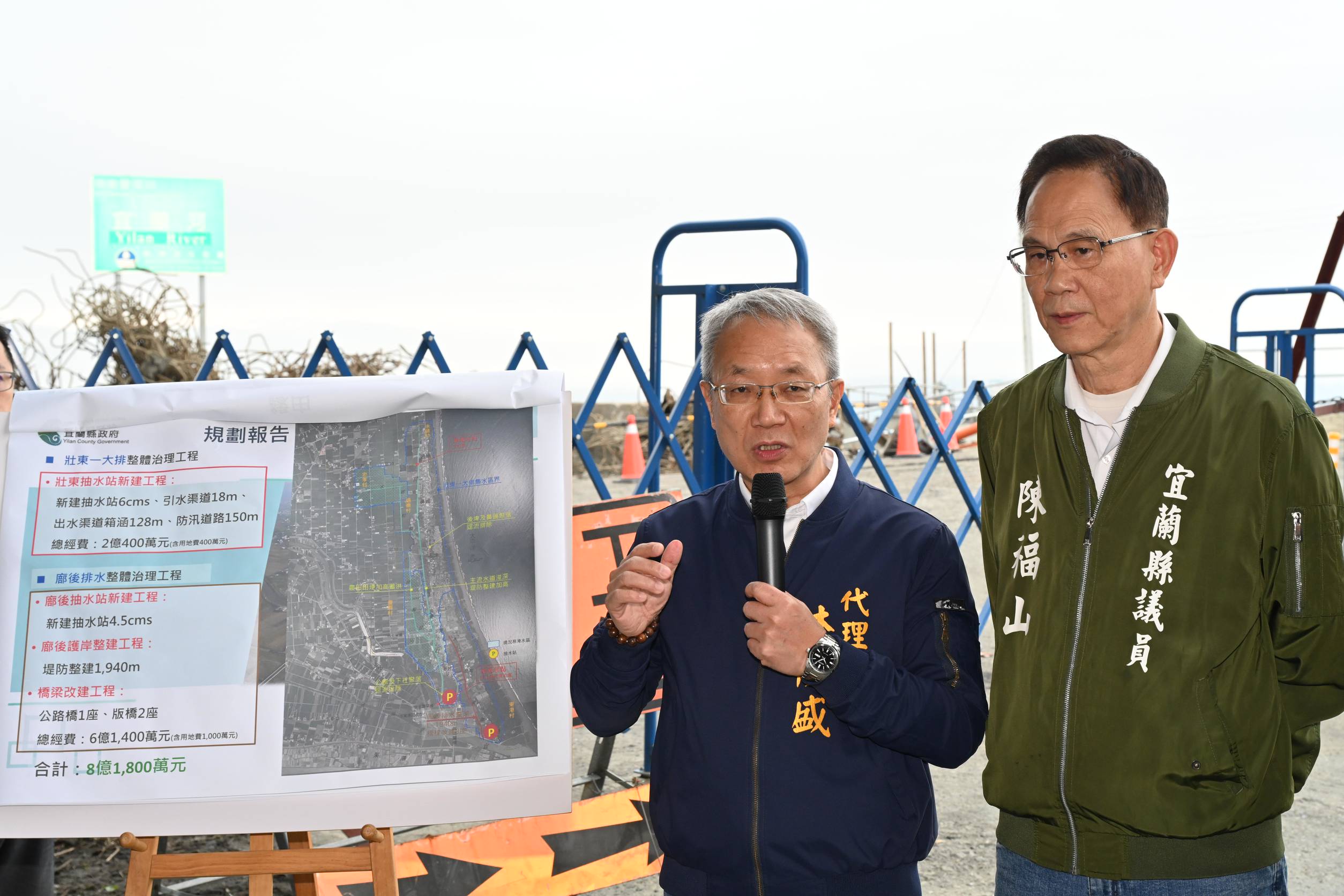 宜蘭縣地勢低平且降雨集中,颱風與豪雨期間常造成局部地區積淹水,尤其壯圍臨海地區地勢更屬低窪,宜蘭縣政府推動抽水站及排水系統改善工程,爭取經濟部補助「壯東抽水站新建工程」及「廍後抽水站及廍後排水改善工程」經費共計8億1,800萬元,並已完成治理規劃報告,為加速工程推動進程,宜蘭縣政府於115年度預算中編列壯東抽水站設計經費600萬元,以及廍後抽水站設計經費1,050萬元,並前行發包設計,待中央核定補助後,將可無縫接軌辦理興建工程。