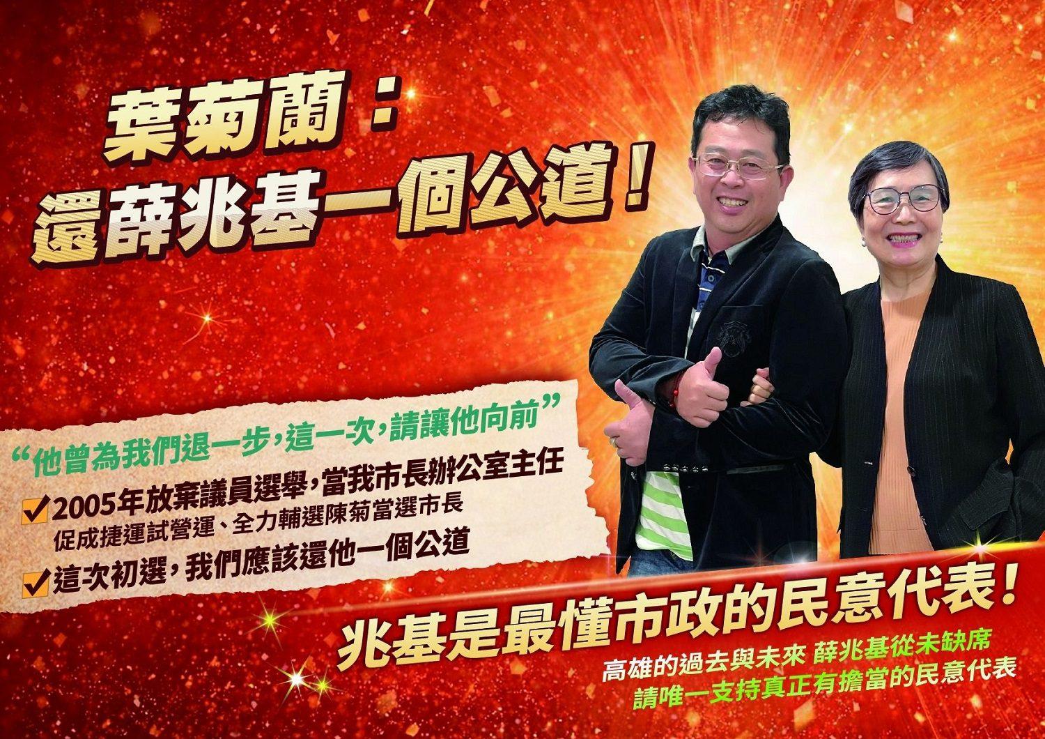 在選戰最喧囂、真相最容易被遮蔽的時刻,一段塵封近二十年的市政往事,再度被推上檯面。高雄市議員初選進入白熱化階段,前高雄市代理市長、現任圓山飯店董事長葉菊蘭罕見公開發聲,親自為薛兆基澄清外界流言。她直言,民主政治不應建立在刻意扭曲的指控上,當政治語言逐漸失真,社會更應回到事實與良知,為一位曾選擇承擔而非曝光的政治工作者討回公道。