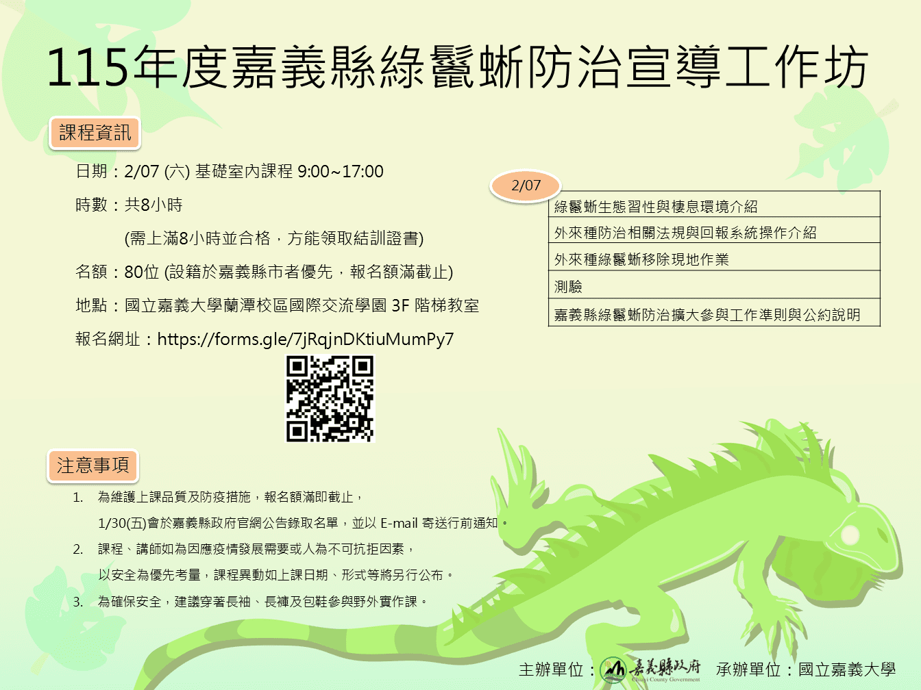 嘉義縣政府為移除外來入侵物種綠鬣蜥,將於2月7日在國立嘉義大學舉辦「115年度嘉義縣綠鬣蜥防治宣導工作坊」,參與基礎訓練及實務合格後,可加入移除團隊執行移除工作,依據移除個體大小可獲100元或500元獎勵金。