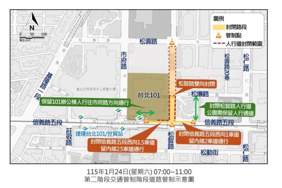 臺北市公共運輸處表示,因應影視拍攝使用,1月24日(星期六)上午7時至11時(視現場狀況調整),管制松智路(松壽路-信義路5段),基隆路幹線、28路等8線公車將受影響,並取消停靠共5個站位,請民眾至改道動線上既有站位候車。若當日遇雨取消拍攝,將變更於1月25日(星期日)上午7時至11時進行拍攝作業。