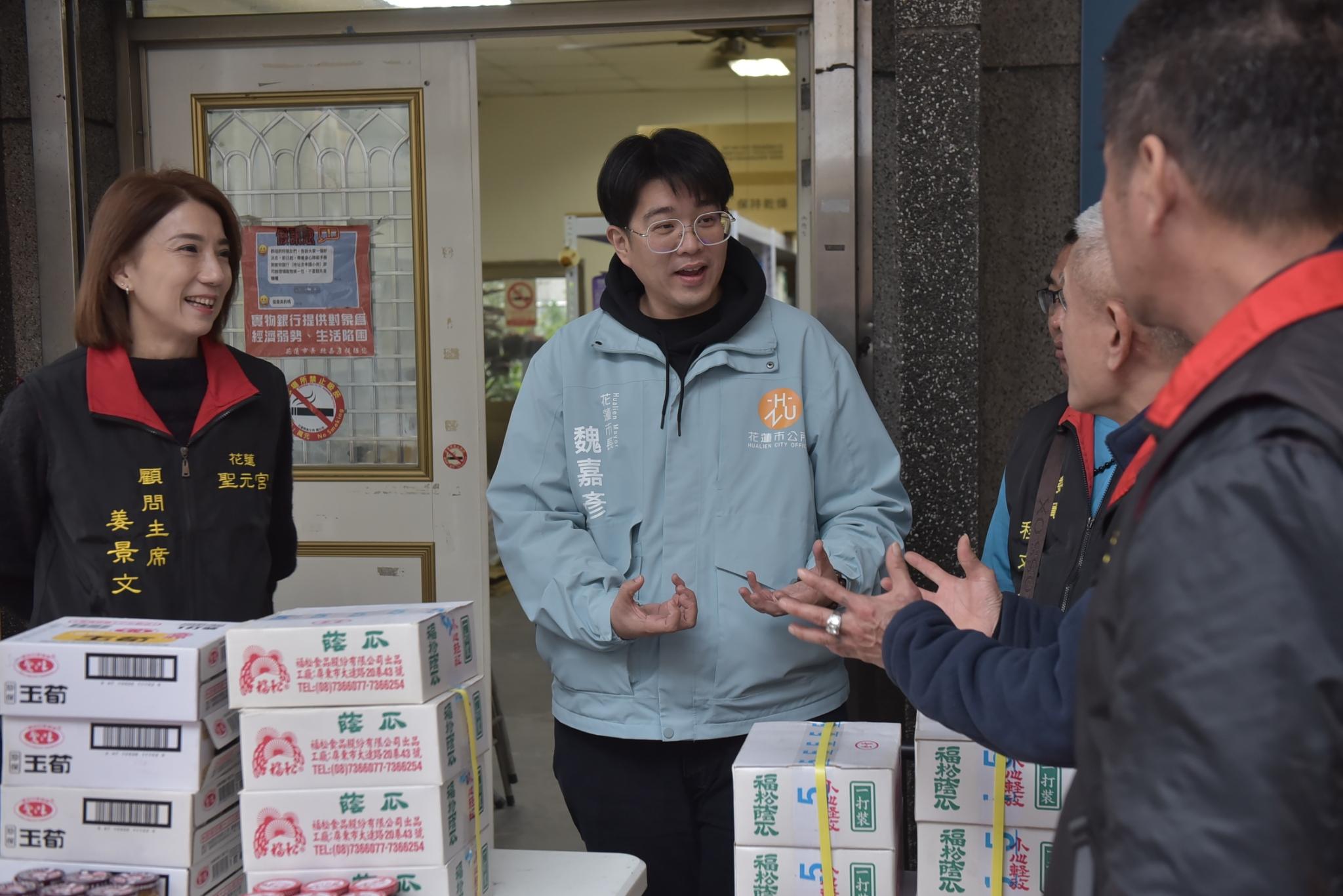 花蓮聖元宮顧問主席姜景文、副主委曹和杉、總幹事曹勝輝及黃文聰等多位委員,捐贈40箱罐頭、10箱衛生紙等生活用品,市長魏嘉彥贈狀感謝善心義舉,在歲末年終之際,給予需要幫助的弱勢一份溫暖。
