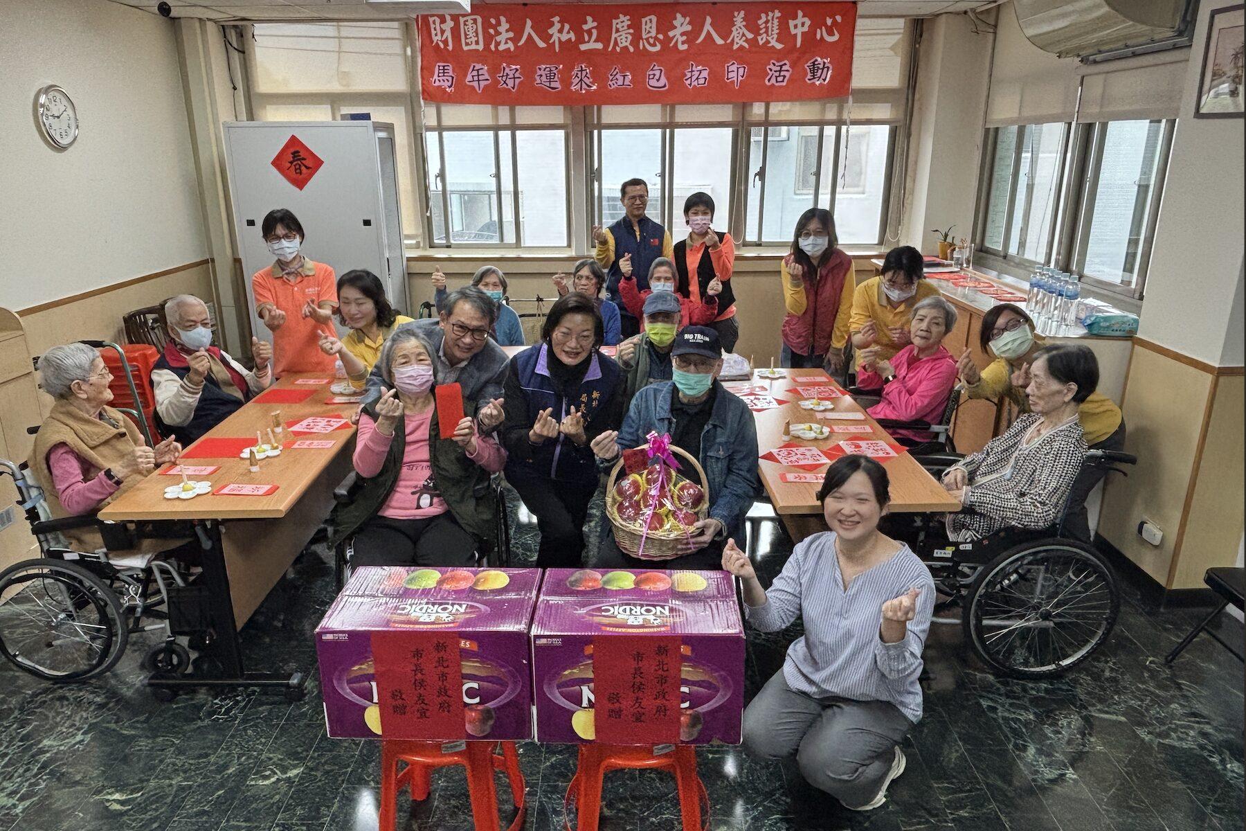 農曆年節將屆,新北市社會局長李美珍和副局長吳淑芳,26日上午前往新店財團法人私立廣恩老人養護中心,及深坑財團法人天主教福利會附設約納家園關懷訪視,並代表侯友宜市長致贈春節加菜金及蘋果禮盒。廣恩的長輩親手製作「柿柿如意」春聯回贈,讓李美珍相當感動。在約納家園的小朋友,李美珍則另外各致贈一個小紅包,並祝學業進步。