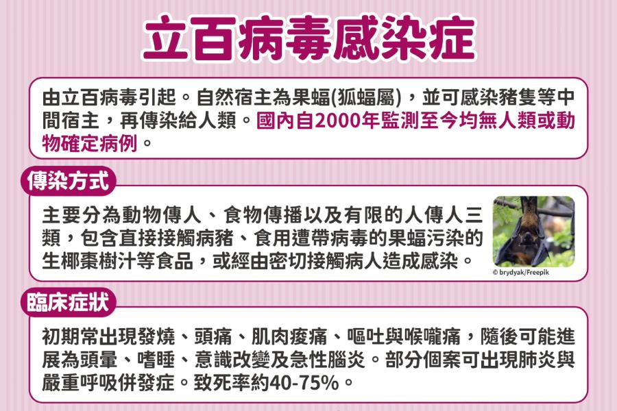 疾管署說明,立百病毒感染症為人畜共通傳染病,其自然宿主為果蝠(狐蝠屬),並可感染豬隻等中間宿主,再傳染給人類。傳播途徑主要分為動物傳人、食物傳播以及有限的人傳人三類,包含直接接觸病豬、食用受果蝠(狐蝠屬)尿液或唾液污染的食品等,或經由密切接觸病人的血液、體液、呼吸道分泌物造成感染。臨床症狀表現廣泛,包括無症狀感染、急性呼吸道症狀到致命性腦炎均可能發生。
