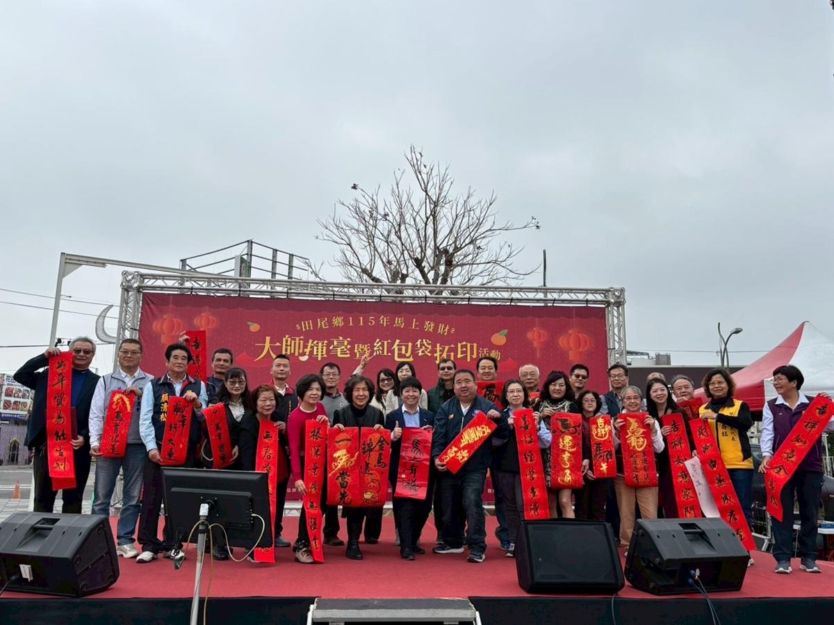 為迎接新春到來,田尾鄉公所於1月31日上午,在田尾怡心園北側廣場辦理「115年馬上發財~大師揮毫暨紅包袋拓印活動」,活動現場吸引了上千名鄉親共襄盛舉,共襄盛會,不僅讓怡心園充滿了過年熱鬧滾滾的氛圍,還彰顯了在地凝聚力和創造力。