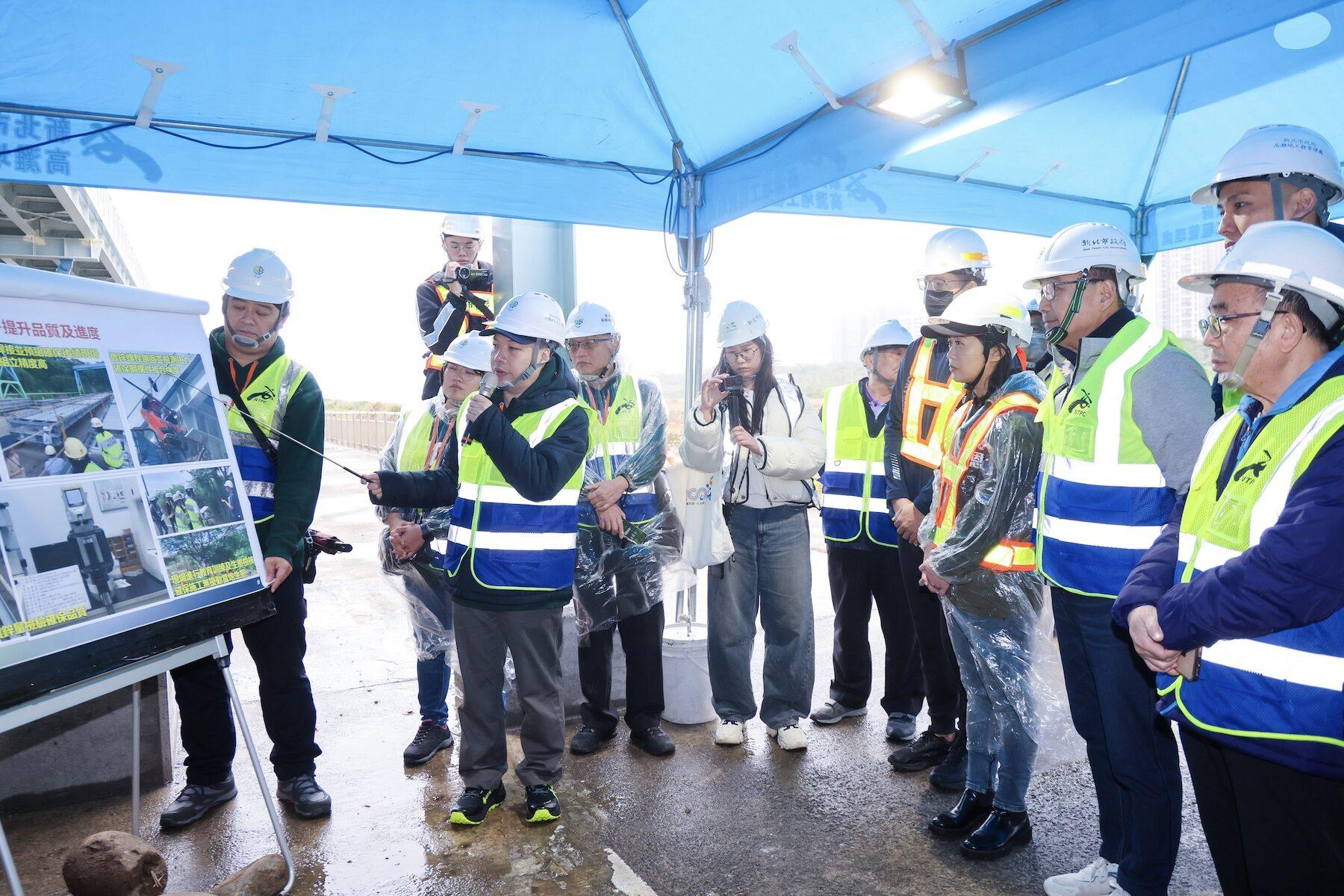 侯友宜指出,淡水海堤段工程沿堤頂施作,是整體路網的重要環節,以高架鋼構橋落柱於海堤混凝土結構,施工難度高。他特別感謝施工團隊的努力,目前工程進度超前,預計7月底前完工。