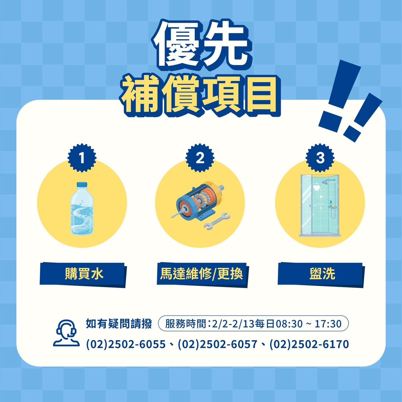 新工處表示,民眾若有申請「購買水」、「馬達維修或更換」、「盥洗費」等3項優先補償以外的項目,市府已委託第三方公正單位釐清責任,預計115年3月底提出鑑定結果後,將請應負責單位再與民眾協調。