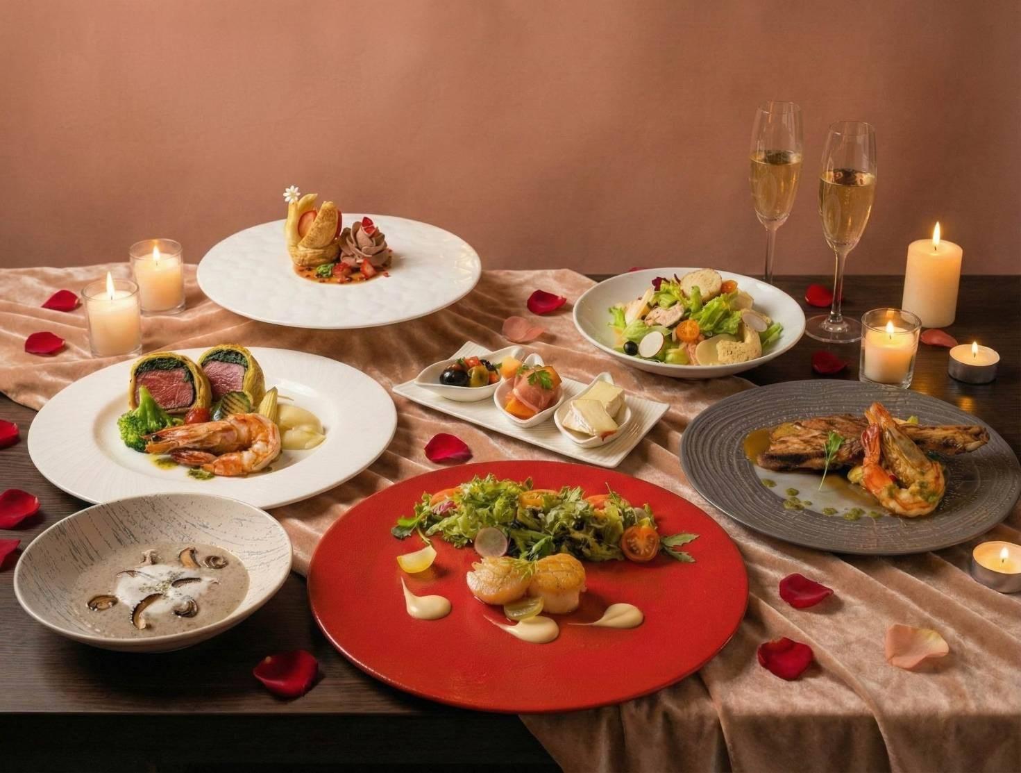 在餐飲規劃上,大地酒店旗下《喜歡西餐廳》在活動期間推出情人節限定「隱世情詩|極致海陸饗宴」,以細膩料理手法為節慶餐桌書寫浪漫詩篇,每位價格為1980元加1成服務費。主廚以愛情為題,讓每一道料理的香氣與口感隨著情感升溫層層遞進,前菜以初戀般酸甜的「嫩煎干貝襯葡萄夏多內醬」揭開浪漫饗宴,亦酸亦甜的細緻尾韻,如同愛情剛萌芽時,那份微醺且優雅的試探。主餐則提供兩款海陸雙拼選擇,包含「酥皮翼板牛佐青醬根島生態大蝦」,口感豐富的金黃酥皮,溫柔包覆著菠菜的翠綠與翼板牛的醇厚脂香,搭配生態蝦的鮮甜彈牙,每一口都是愛戀的驚喜;「炭烤低溫戰斧豬排佐青醬根島生態大蝦」則嚴選台灣在地戰斧豬排,24小時低溫入味,再以直火炭烤鎖住原始肉汁,粗獷的炭香與海味的鮮甜在口中衝撞,是兩人關係中最真實、最鮮活的火花。套餐最後以造型精緻的玫瑰巧克力與天鵝絨泡芙甜點作為收尾,以莓果的酸點綴巧克力的苦甜,層次分明,餘韻悠長,這不只是甜點,是寫在舌尖上的情書。