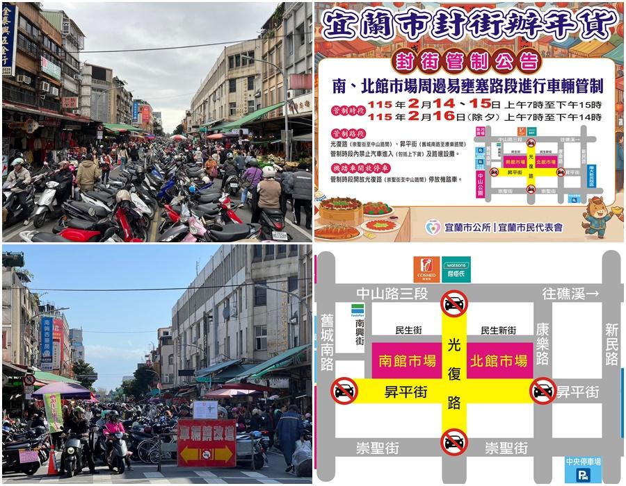 宜蘭市公所表示,活動期間為2月14日至15日上午7時至下午3時、2月16日除夕當天上午7時至下午2時,於光復路(崇聖街至中山路間)、昇平街(舊城南路至康樂路間)等4處路段實施汽車交通管制,光復路段將開放作為機車及腳踏車停放區,方便民眾辦年貨。