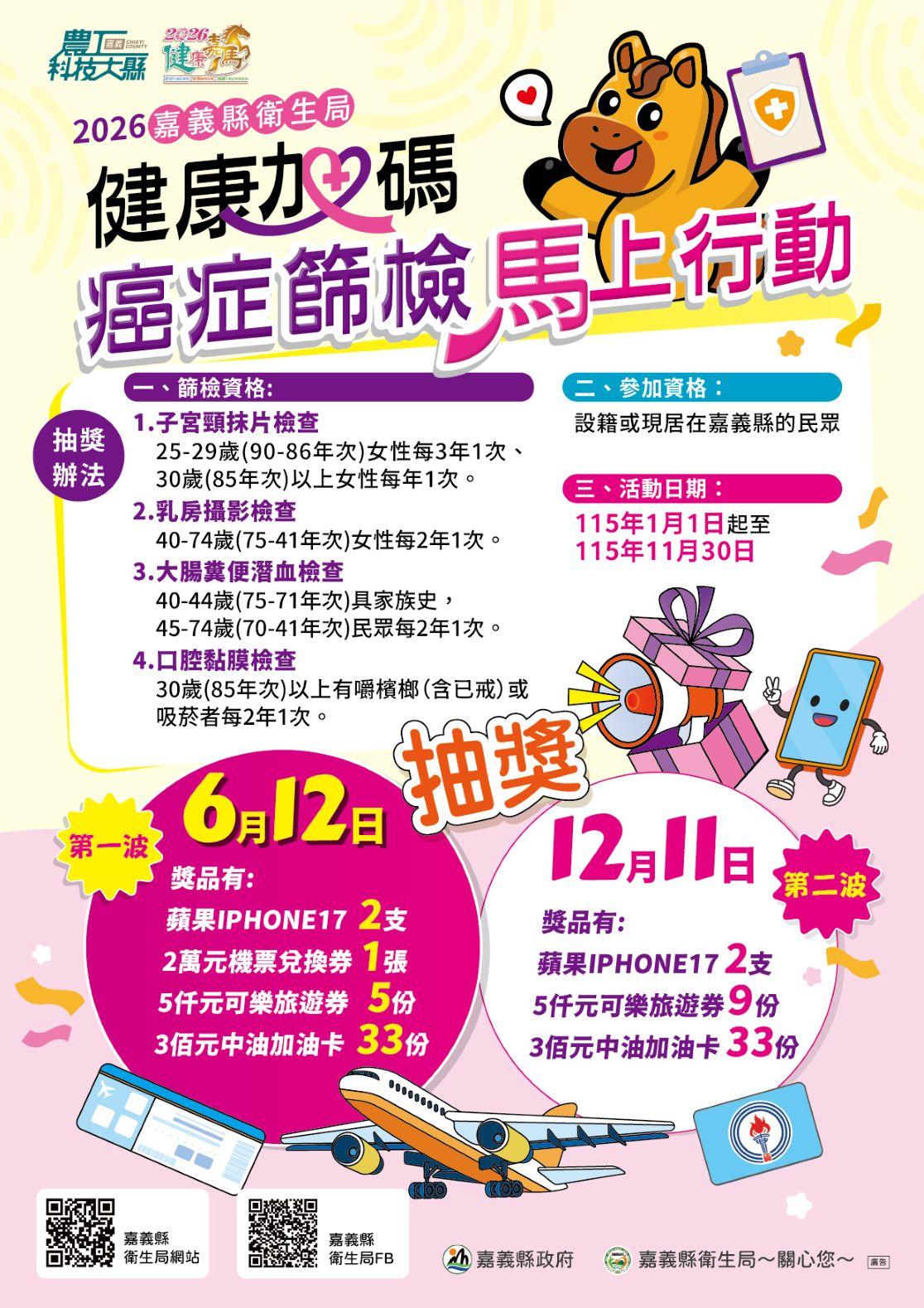 嘉義縣擴大六癌免費篩檢,舉辦「健康加碼抽72萬好禮」活動,即日起至11月30日止,凡符合資格的縣民完成指定癌症篩檢項目,即可參加兩階段抽獎,獎項包含最新iPhone 17、2萬元機票兌換券及各式禮券。