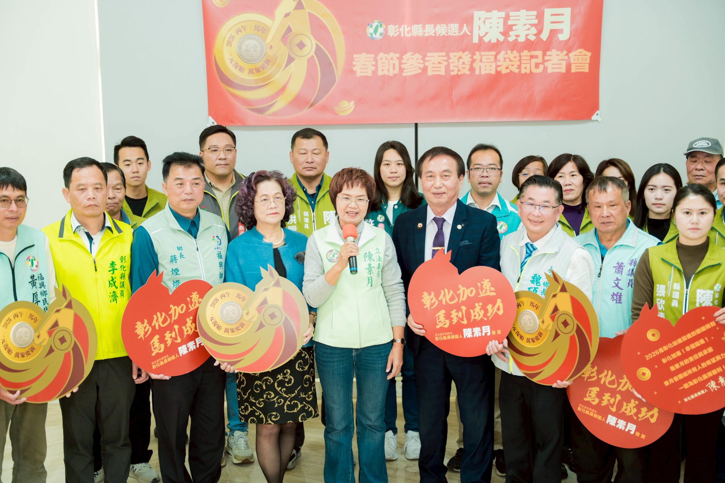 陳素月將於春節期間展開全縣走春行程,預計走訪 26 個鄉鎮的重要信仰中心參香祈福,並發放福袋,向鄉親拜年。陳素月表示:「彰化的未來不能再等,這個赤兔馬福袋不只是一個紀念品,更是一份承諾。」素月承諾未來如能獲得鄉親的支持,帶領彰化縣,將以赤兔馬的衝勁與毅力,為彰化鄉親的福祉與地方建設努力打拼,積極解決幾項重大建設延宕的問題、加速完成的期程,讓彰化鄉親能感受到彰化進步的幸福果實!