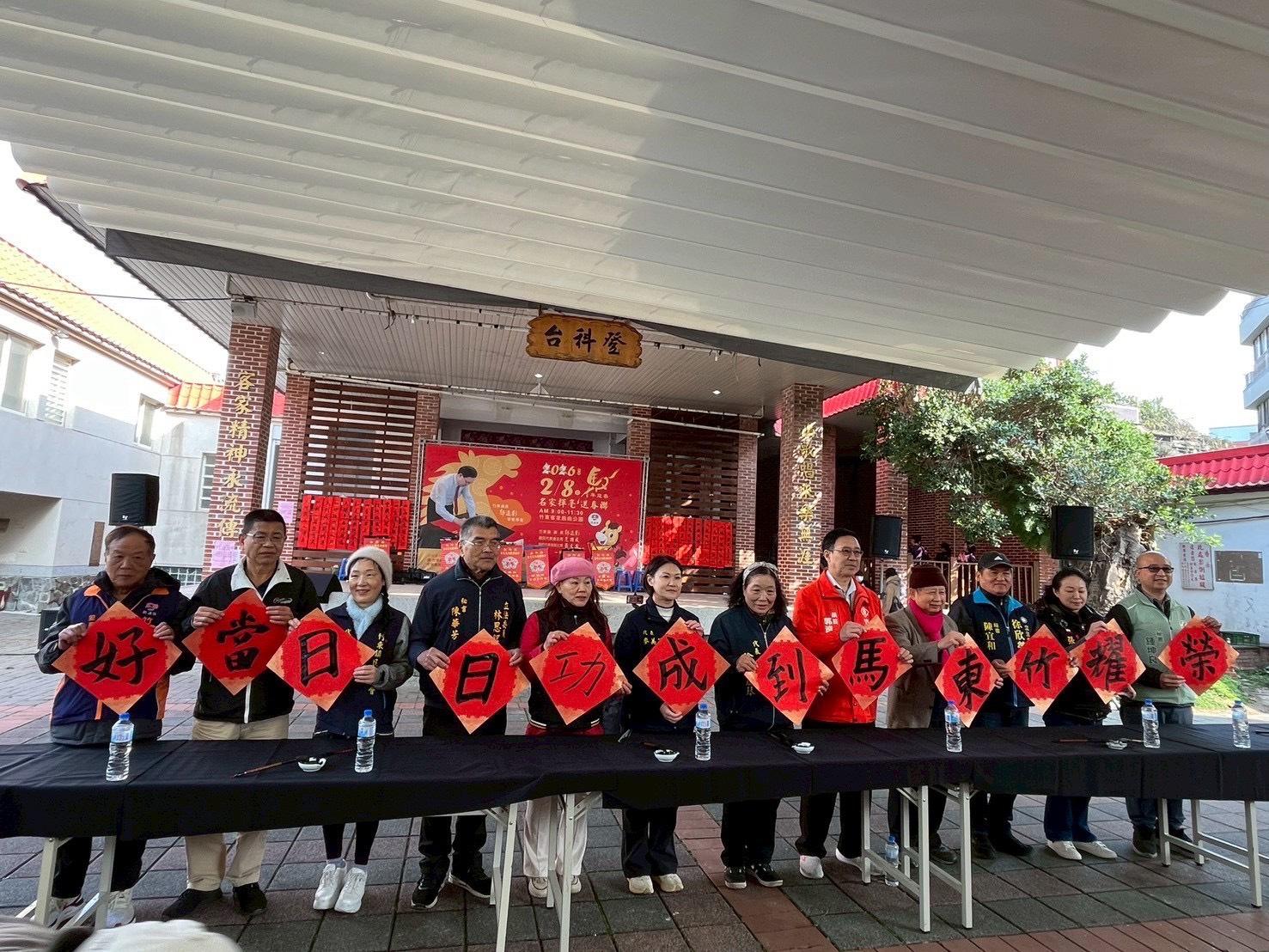 ▲新竹縣竹東鎮公所2月8日上午在竹東客家戲曲公園舉辦2026「馬年迎春名家揮毫送春聯活動」,現場還安排有社團歌舞表演,增添藝文氛圍。(圖/竹東鎮公所提供)