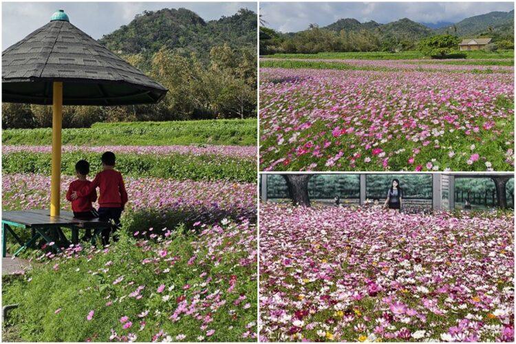 波斯菊花園,位於台東成功台11線成功農會全家超市旁,在公路旁停車走幾步路,即可免費入園欣賞,園區設置鞦韆、涼亭、休閒椅等設施,迎接馬年還有一匹駿馬定點藝術装置,提供遊客騎乘拍照,顯然最受遊客歡迎。