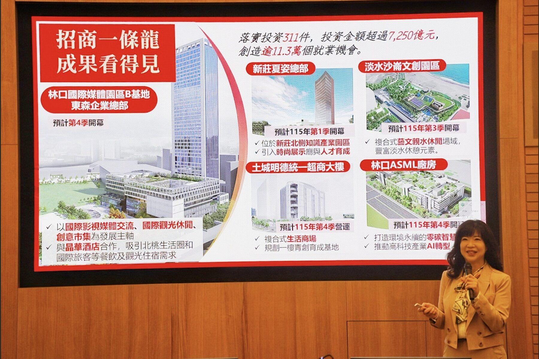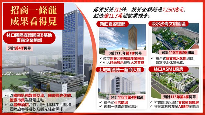 在招商引資方面,新北「招商一條龍」成績斐然,已落實投資311件,投資金額逾7,250億元,創造逾11.3萬個就業機會。115年度預計完成板橋「馥華艾美酒店」、林口「東森企業總部」及「ASML艾司摩爾」林口廠房等投資案。市府今年也持續協助企業開發多元市場,帶領企業4月前往中東沙烏地阿拉伯參加「中東先進科技展」,並至阿曼商洽,以及6月到美國參加「北美自動化技術展」搶攻全球訂單,展現新北接軌國際的強大實力。