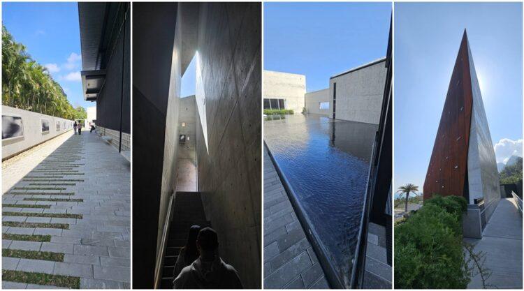 藝術園區的五棟建築景觀造型,正是江賢二藝術作品樣貌,建築空間呈現多樣三角設計,引入不同角度光線射進室內,展區藝術作品,因光影變化更見生動。