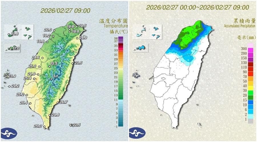 今天2月27日鋒面通過及東北季風增強,北部及東北部天氣轉涼;臺灣中部以北及馬祖、金門有短暫陣雨或局部雷雨,並有局部較大雨勢發生的機率,東半部地區及恆春半島有短暫陣雨,南部山區及澎湖有局部短暫陣雨,其他地區亦有零星短暫陣雨。