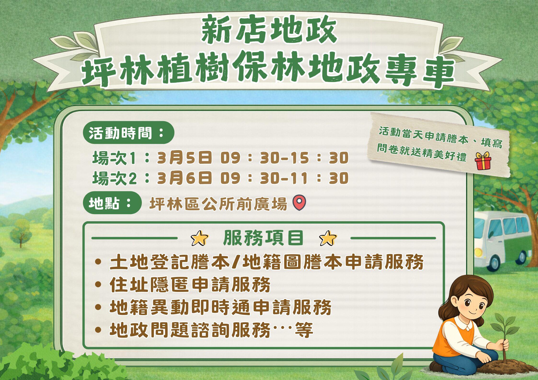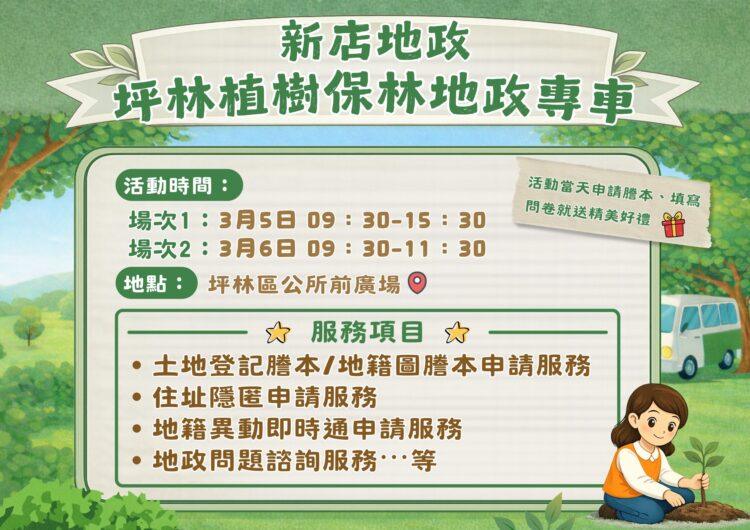 新北市新店地政事務所「植樹保林謄本申請服務地政專車」即將巡迴至坪林服務囉!本次主題式專車共出隊2場,分別為115年3月5日上午9時30分至15時30分、3月6日上午9時30分至11時30分,於坪林區公所前廣場為鄉親們服務,歡迎到現場體驗地政專車的便利與貼心!