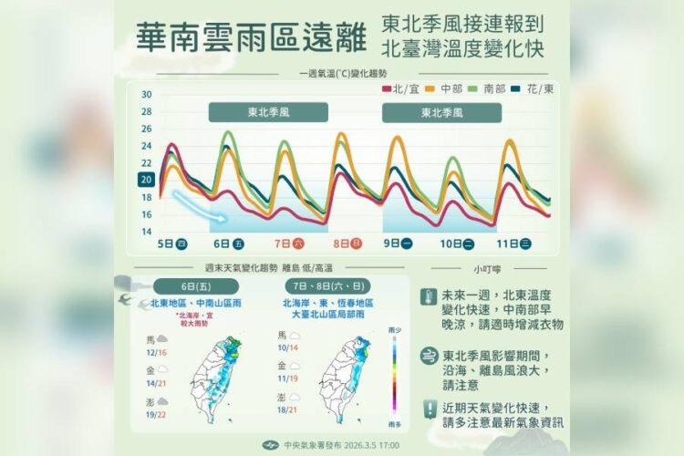 氣象署進一步詳細說明,3/6(五)東北季風增強,北東地區、中南部山區容易降雨,北海岸和宜蘭地區雨勢稍明顯,北臺灣溫度下降5-6度,中南部早晚涼、日夜溫差;3/7、8(六、日)降雨稍緩,雨區縮小至東半部地區、基隆北海岸、大臺北山區仍有局部短暫雨,7日大臺北零星雨,中南部平地多,溫度上,7日北臺灣最涼,花蓮溫度下降2-3度,中南部早晚涼、日夜溫差大;8日隨東北季風減弱後,溫度再回升。
