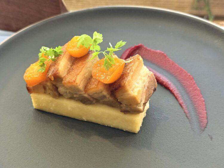 選用桃園黑毛豬,以法式油封技法低溫慢煮,完整保留肉質水分與細緻油脂,煎製至外層金黃酥脆、肉質柔嫩化口。搭配手工鷹嘴豆豆腐與糖漬宜蘭金棗,酸甜清香平衡濃郁肉脂。這道料理不僅是法式工藝與台灣食材的融合,更是工法淬鍊的體現。
