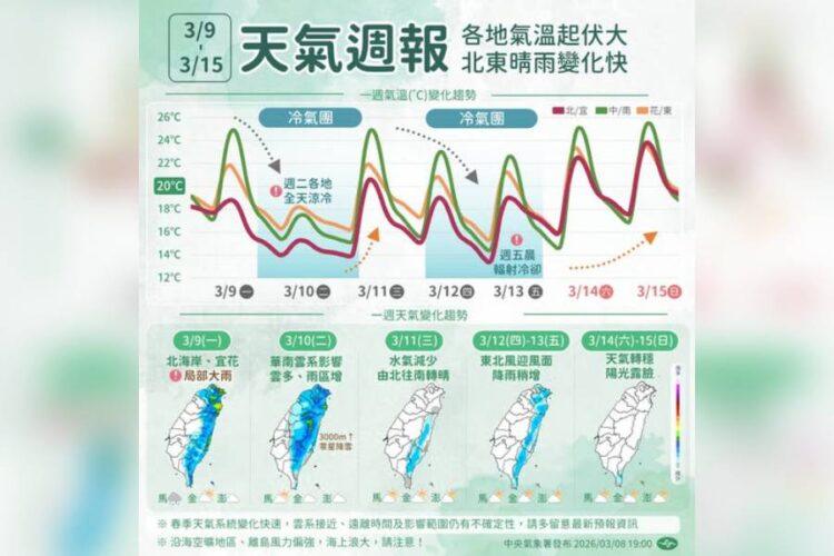 本周天氣變化快,忽冷忽暖多留意!中氣氣象署說明,本周有兩波冷空氣,氣溫起伏明顯,北東晴雨交替快,周二雲多雨區較廣,外出前請多留意最新預報,適時保暖及備雨具。