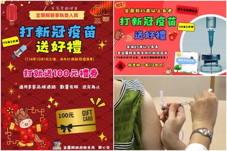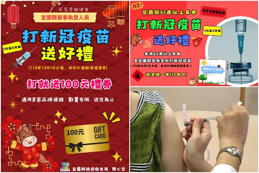 為提升高風險族群防護力,宜蘭縣政府衛生局推出新冠疫苗接種加碼鼓勵措施,即日起,凡於114年10月1日以後尚未接種新冠疫苗的65歲以上長者,到縣內12鄉鎮市衛生所完成接種,即可獲得「衛生紙1串(12入)」1份;醫事執登人員接種新冠疫苗,亦可獲得「100元禮券」1份,數量有限,送完為止。