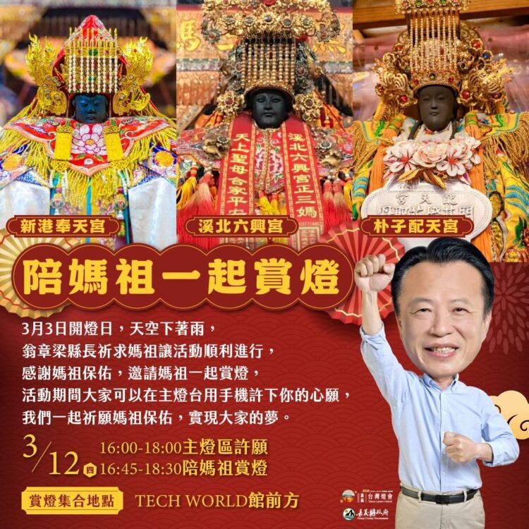 嘉義縣長翁章梁表示,燈會開燈日前因連日降雨,縣府團隊一度十分擔心天候影響活動,因此特別向媽祖祈願,希望燈會能順利舉行。當日下午雨勢逐漸停歇、天氣轉好,讓開燈典禮與賞燈活動順利展開。為表達感謝之意,縣府特別邀請新港奉天宮、溪北六興宮及朴子配天宮的媽祖蒞臨燈會,與民眾一同欣賞燈景,感受嘉義燈會的魅力。