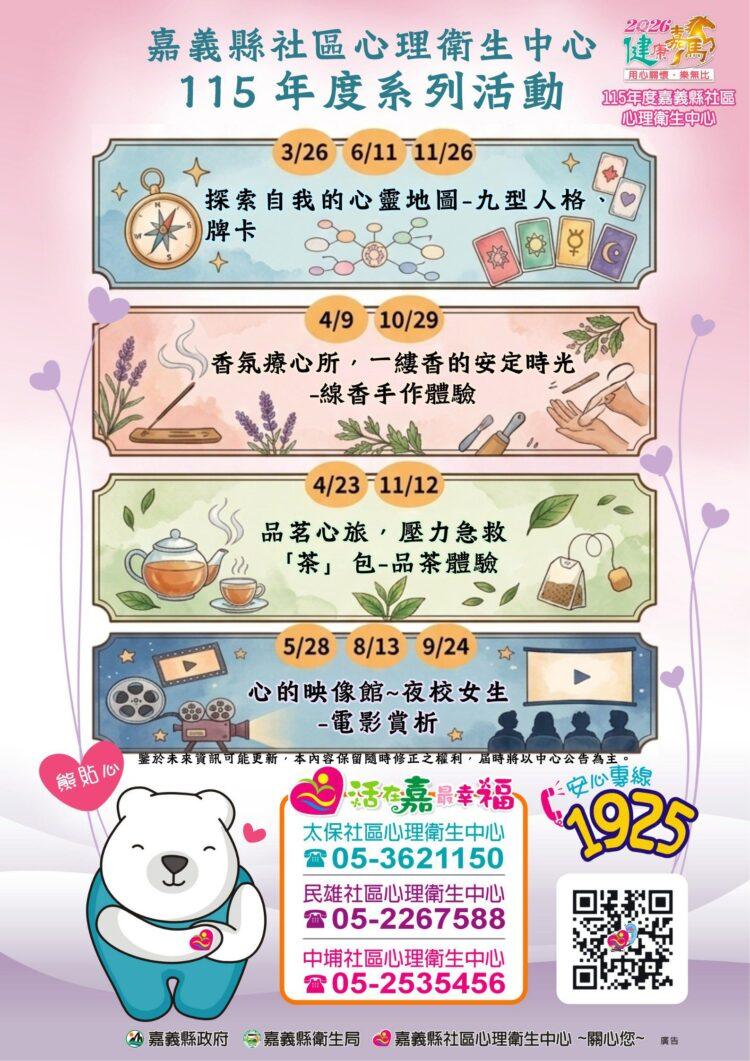 趙紋華表示,隨著生活型態快速變化,心理壓力來源日益多元,縣內設有太保、民雄、中埔三處社區心理衛生中心及服務專線3621150,希望透過推動社區化、在地化的心理衛生服務,落實「活在嘉 最幸福」的施政願景。如有活動相關資訊想了解,都可電洽嘉義縣社區心理衛生中心專線05-3621150或1925安心專線。