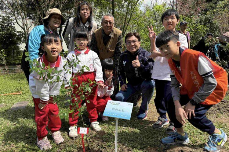 ▲新北市長期推動植樹行動,劉和然(12)日至板橋區大觀國小與15家企業代表一起種下9種原生種樹苗,讓永續新希望向下發根。(圖/新北市農業局 提供)