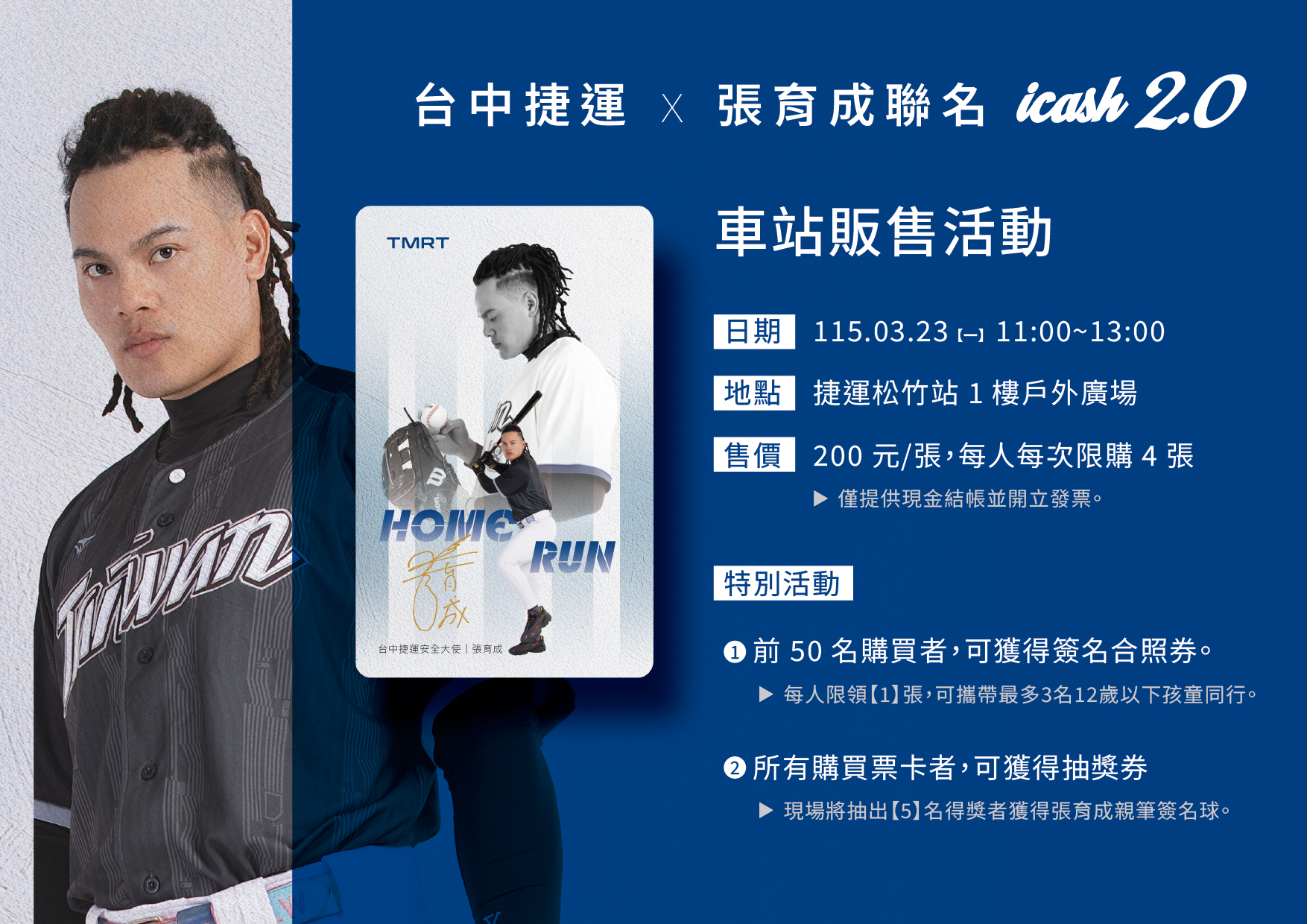「國防部長」張育成的震撼強打將在台中捷運重現!台中捷運公司今日宣布,邀請 2026 WBC 英雄張育擔任年度安全大使,並將於 3 月 23 日在捷運松竹站舉辦首場球迷見面會。活動當天除了限量首賣極具紀念價值的「張育成 icash 2.0 聯名卡」,前 50 名購卡球迷更能獲得難得的近距離合照機會。中捷此舉不僅展現守護乘車安全的決心,更結合 7-ELEVEN 點數回饋計畫,邀請全民一起搭捷運、拿點數,近距離感受強打少年的巨星魅力。