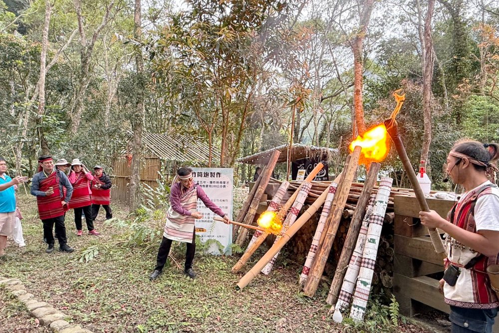 ▲農村水保署臺中分署陳榮俊分署長攜手學員共同體驗迎賓竹筒炮。(圖/農村水保署提供)