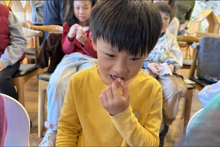 當孩子們鼓起勇氣咬下一小口火蔥時,教室立刻熱鬧起來,「好辣!」、「哇!」的聲音此起彼落。有的孩子整張臉皺成一團,有人辣得直搧舌頭,也有人被同學的表情逗得笑到停不下來。由於參加活動的大多是低年級學生,老師還準備了醬油膏,讓孩子們試著把火蔥蘸著吃。有的孩子先小心咬一口,再蘸一點醬油膏慢慢嚐,雖然仍被辣得直喊「好嗆」,卻又忍不住笑著再試一次。桌上同時放著蕗蕎作為比較,孩子們一邊嚐一邊討論兩種植物的差別,整個教室充滿笑聲與討論聲。