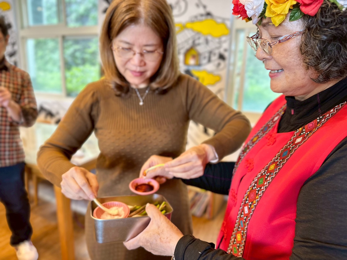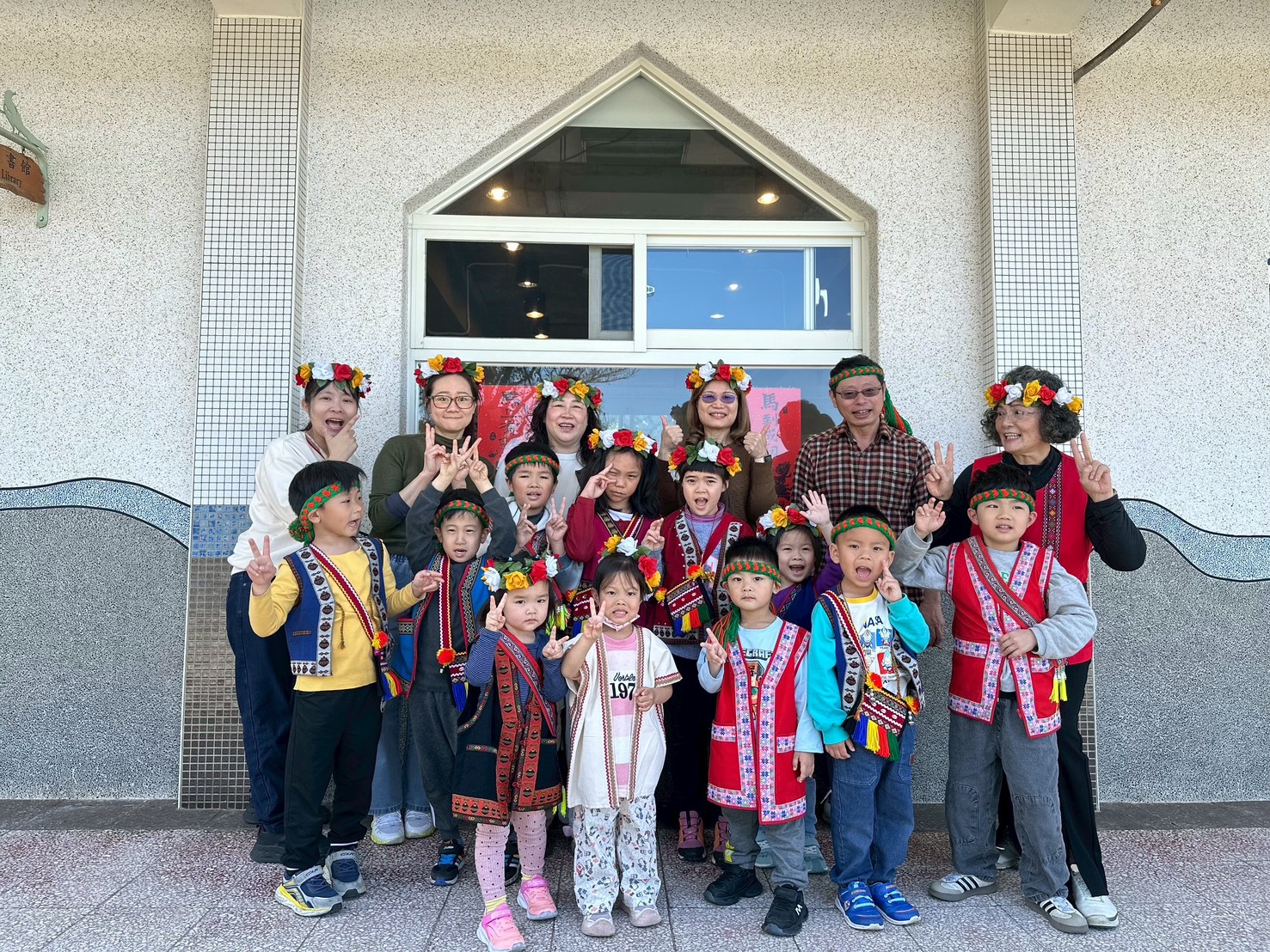 除了味覺體驗,現場也安排了改良式的原住民族服飾體驗,孩子們輪流戴上花環、背起情人袋,或穿上背心與披肩,在老師與奶奶的介紹下,認識這些服飾在部落文化中的意義。從剛剛被火蔥辣到的驚呼,到開心試穿服飾,整堂閱讀課像一場逐步展開的小冒險,也讓孩子們在輕鬆的氛圍中接觸不同族群文化的樣貌。