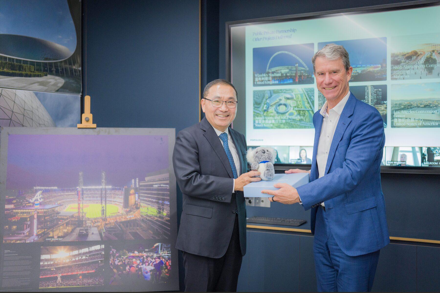 新北市長侯友宜(17)日參訪國際知名運動與娛樂場館設計公司 Populous亞太區總部,與該公司全球總監暨共同創辦人Paul Henry會面交流,會中由副首席建築師Nick Malyon分享參與多項美國職棒大聯盟(MLB)場館專案的經驗,提供新北大巨蛋及其他體育場館規劃參考。