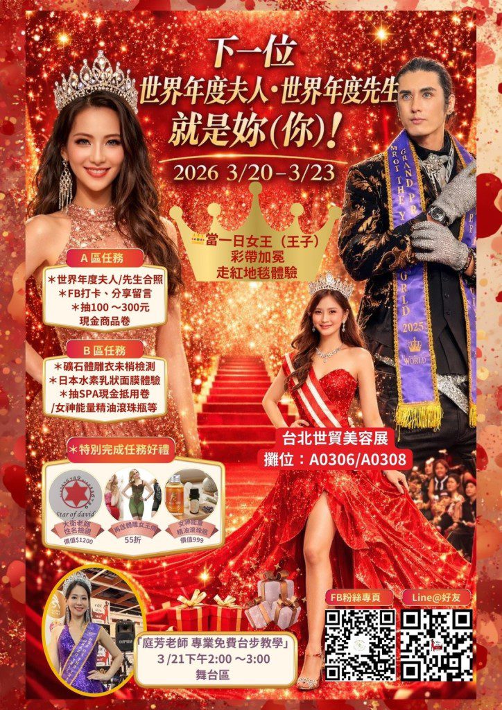 亮兔菈菈社長徐郁善表示,此次展覽特別規劃A區與B區兩大互動體驗區。參觀民眾只要在A區完成指定任務,包括披上彩帶、戴上皇冠與「世界年度夫人、先生」主題背景拍照打卡,並追蹤官方社群平台及留言分享,即可參加現場摸彩活動,有機會抽中現金商品券,並可走上象徵榮耀的紅地毯前往B區體驗活動。