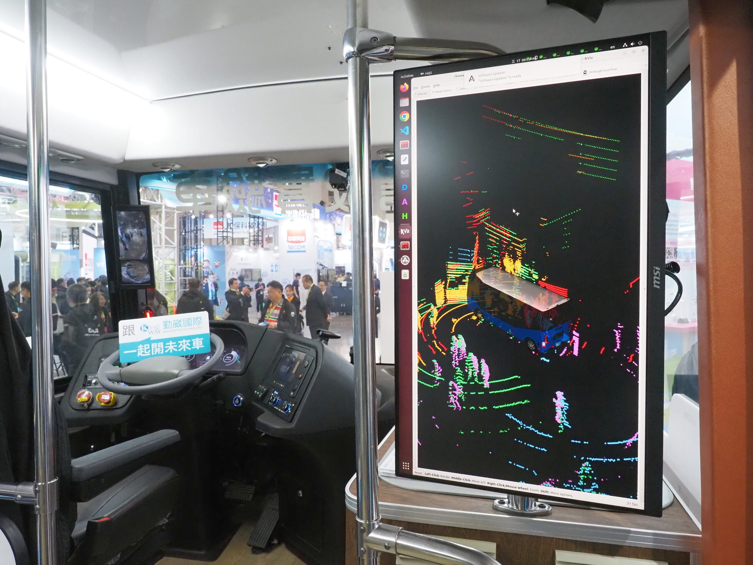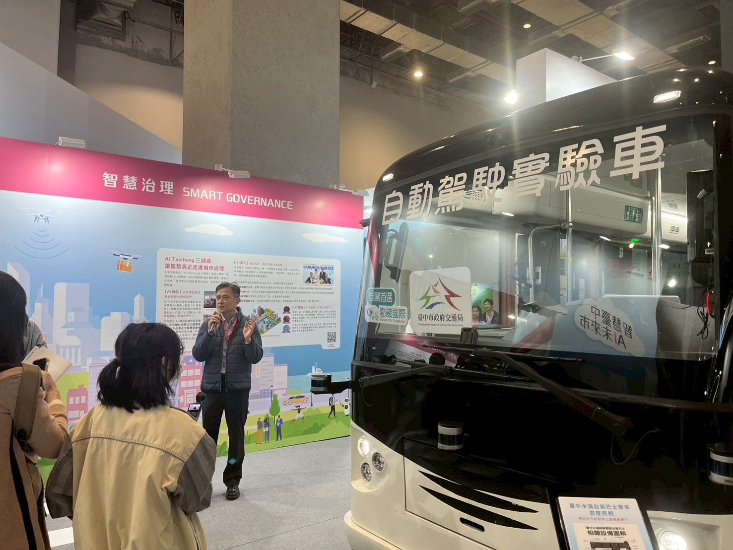 中市首輛自駕車初登場,自駕巴士感測器光學雷達,猶如自駕車的「眼睛」,即時偵測車輛周圍的各類障礙物,包括移動中的行人與靜態展示牆等,前瞻且吸睛的科技應用,吸引大批民眾駐足圍觀,踴躍上車體驗,互動反應熱絡。隨著自動駕駛與車路聯網技術逐步成熟,水湳自駕巴士示範計畫,未來可作為大型活動接駁、園區內短程運輸及智慧交通應用示範,象徵台中邁向智慧城市的重要里程碑。