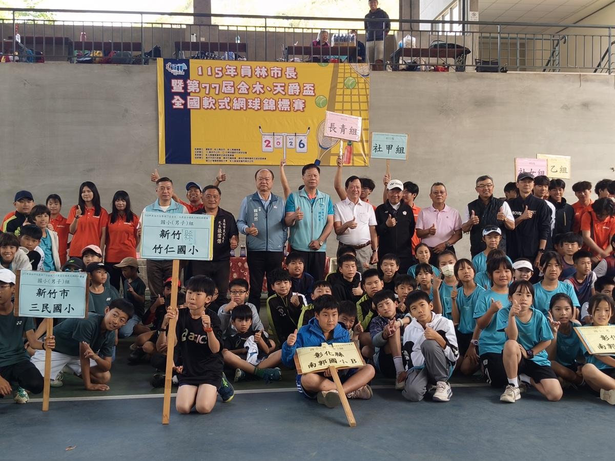 微風徐徐、天氣晴朗,員林市公所於3月20日上午特別在員林運動公園網球場連續二天舉辦「115年員林市長暨第77屆金木、天爵盃全國軟式網球錦標賽」,由員林市代理市長賴致富、市民代表會代表張偉傑、彰化縣政府秘書賴沛然、中華民國軟式網球協會副理事長吳明昌、副秘書長黃錦洲;彰化縣軟式網球委員會總幹事陳浩裕、副總幹事張勝發;員林市體育會軟網委員會主委陳世邦等貴賓到場為來自全國各地好手加油打氣,期待其等能爭取佳績,為校爭光。