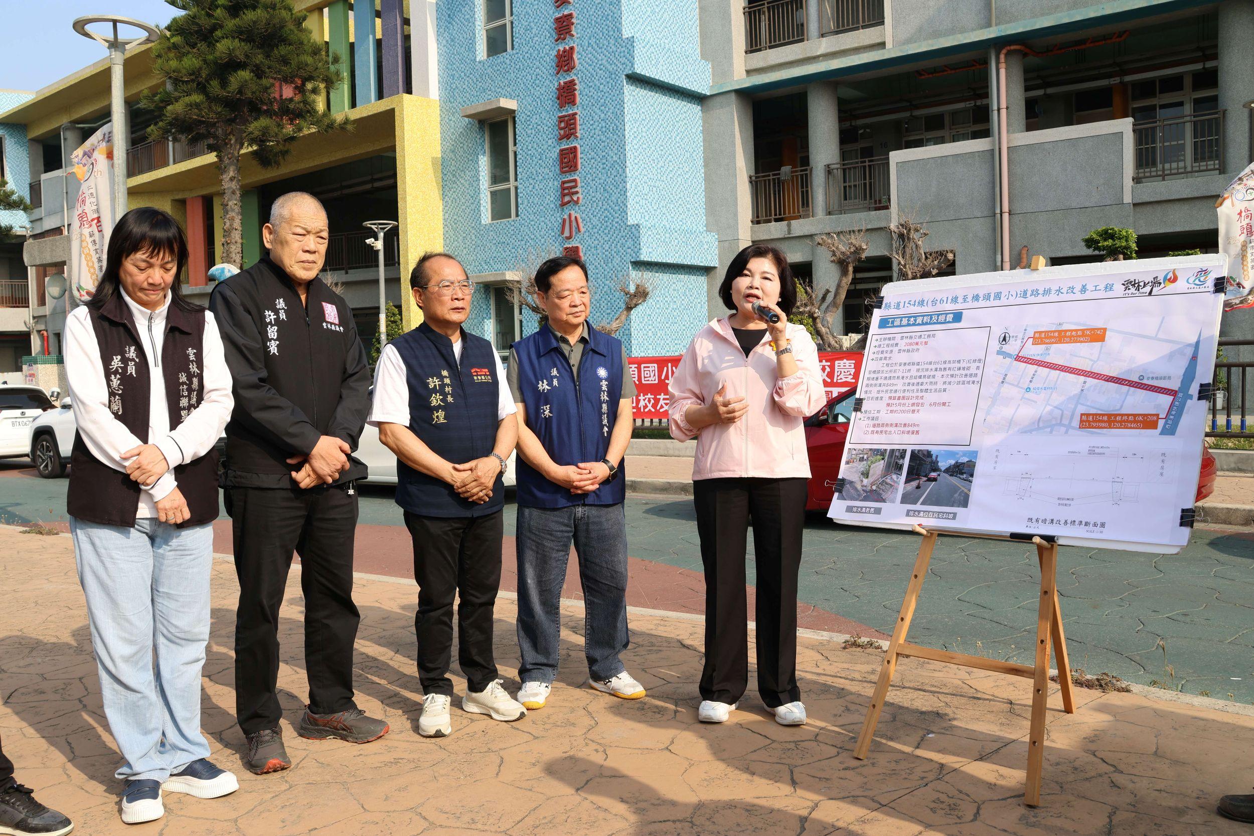 張麗善說,今日經費到位也完成相關規劃設計,特前來現地召開說明會向鄉親報告,縣道154線排水改善工程施工長度兩側合計約849公尺,並新設排水溝渠,工程經費約2,078萬9,000元,預計6月開工,工期200天,新規劃的側溝斷面寬度及深度都已增加,也將採納地方的意見,於7-11路口排水溝轉彎處加強水流的順暢度。