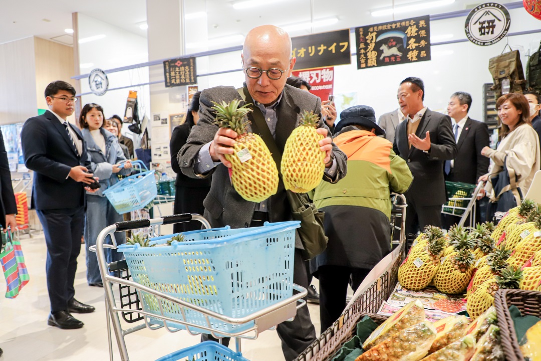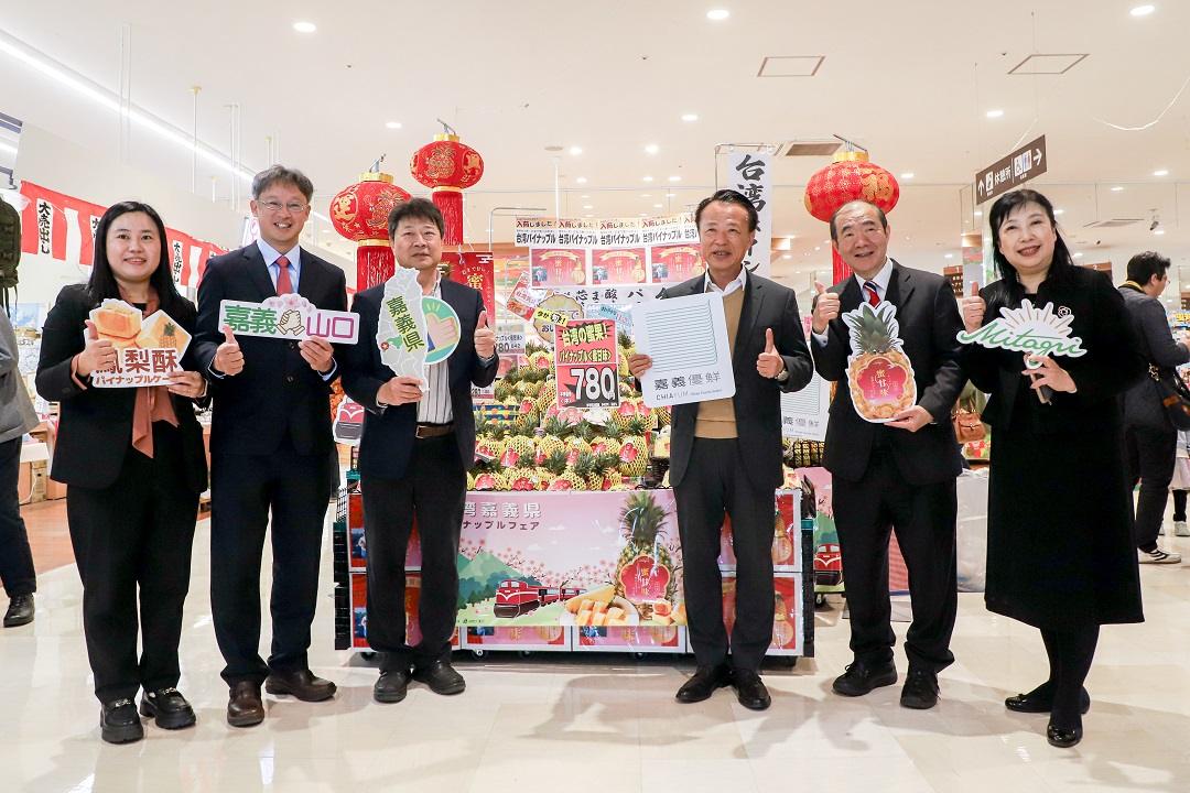 嘉義縣長翁章梁21日與日本丸久株式會社、台農發股份有限公司及打貓果菜生產合作社等代表,在日本山口縣ARUK超市小郡店舉辦「嘉義優鮮-蜜甘味鳳梨嘉年華」開賣記者會,隨後前往防府天滿宮參訪、致贈山口職業籃球隊鳳梨,再一次拓展嘉義農產在日本市場的能見度。