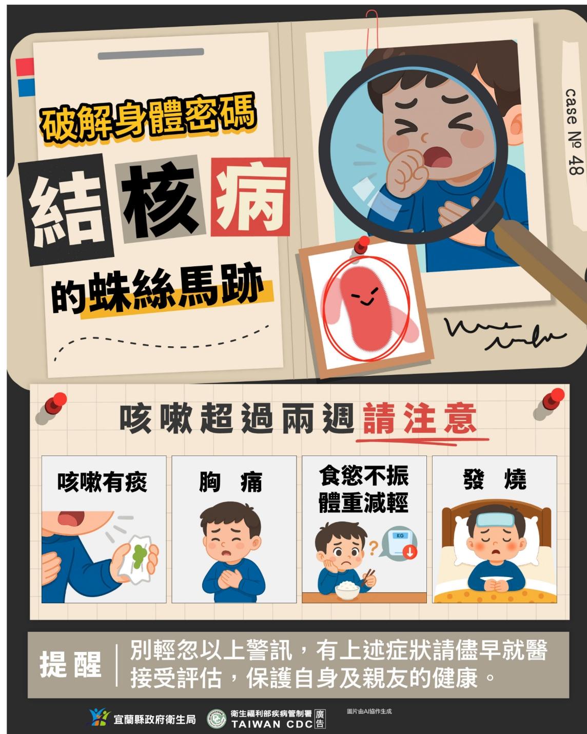 衛生局長徐迺維表示,結核病是透過空氣與飛沫傳染,常見的症狀有咳嗽、胸痛、體重減輕、倦怠、食慾不振,其中若出現長期咳嗽達2週以上,應立即做X光檢查,以早期診斷及治療;萬一不幸感染了結核病,只要按照規則服藥6至9個月,即可治癒。一般人受到結核菌感染後約有5-10%機會發病,當身體免疫力足夠,還可以維持在尚未發病的狀態時就稱為潛伏結核感染。潛伏結核感染沒有症狀,也不具傳染性,但在免疫力低下時,就可能發病成為結核病,並造成傳播。若能在潛伏結核感染期間,配合醫師指示及時給予潛伏結核感染投藥治療,即可消滅潛藏體內的結核菌,降低日後發病的風險。為加快降低本縣結核病之發生率,並配合疾病管制署逐步擴大對潛伏結核感染患者之檢驗及治療,宜蘭縣政府除對現有結核病個案之接觸者外,另積極為原民鄉、長期照護機構、外籍配偶及具共病者等高風險族群,進行丙型干擾素釋放試驗(IGRA);對於陽性個案,也及早轉介醫療院所接受潛伏結核感染(LTBI)治療,以達「2035消除結核」的終極目標。