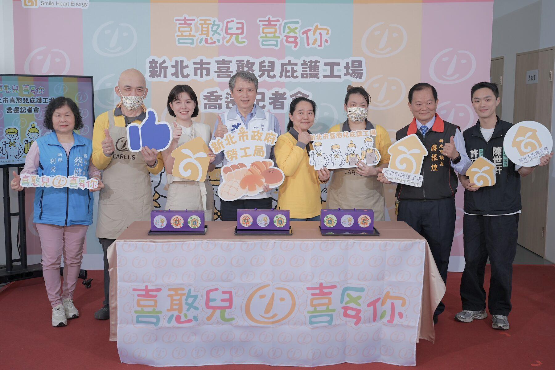 因中和舊廠區改建,「新北市喜憨兒庇護工場」正式搬遷至新莊新址。新北市勞工局(24)與喜憨兒基金會攜手舉辦喬遷活動,局長陳瑞嘉、基金會台北區副執行長楊琇雁、議員戴湘儀及庇護員工們,共同包裝紀念禮盒,同時議長蔣根煌、議員蔡健棠及陳世軒也特別派代表到場致意,祝福庇護工場在新莊重新扎根業績能夠蒸蒸日上。