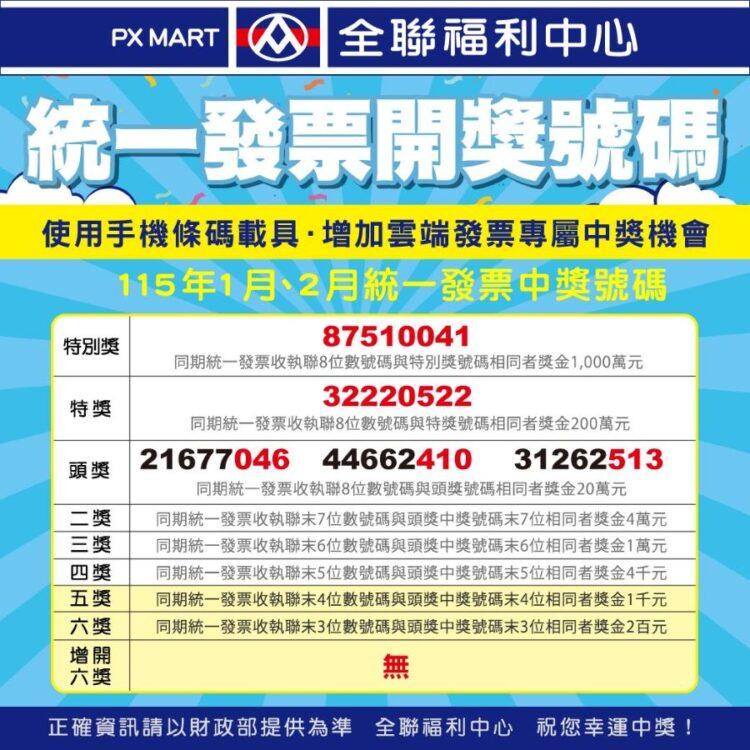 全聯公布,特別獎1,000萬元在台中「向上」門市開出,中獎者僅消費65元購買豆漿、豆腐等商品;至於特獎200萬元則在台北「文山興隆」門市開出,中獎者消費446元購買滷味拼盤、泡麵、飲品等商品,就中了大獎,提醒1、2月有來全聯消費的朋友,記得拿出發票對一對幸運得主可能就是你!