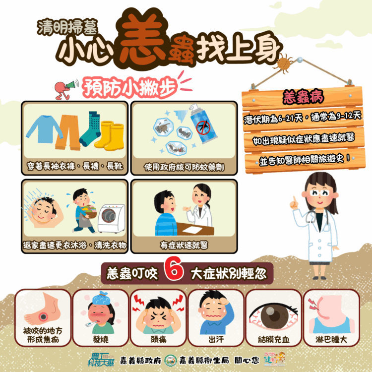 依疾病管制署統計,115年截至3月20日,全國累計28例恙蟲病確定病例,嘉義縣目前尚無確診個案。恙蟲病多好發於春夏季,常見於雜草叢生、灌木及潮濕環境中,潛伏期約6至21天。初期症狀包括發燒、頭痛、倦怠及淋巴結腫大,約一週後可能出現紅色斑狀丘疹、潰瘍及特徵性的焦痂,嚴重者甚至危及生命。