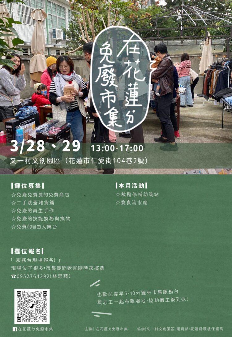 花蓮縣政府在又一村文創園區持續推動「在花蓮ㄉ免廢市集」,有多元主題式攤位,3月28日、29日(週六、週日)下午13:00至17:00,歡迎大家踴躍參與。