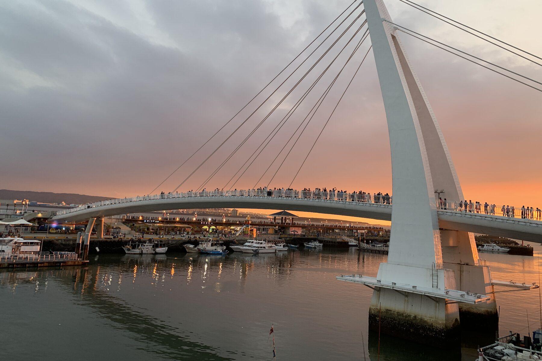 淡水漁人碼頭為新北市著名的觀光景點,兼具漁港作業、休閒遊憩及景觀遊覽等多元功能,其中情人橋更是極具代表性的地標。白色橋身橫跨港區,與周邊海天景致相互映襯,白天可遠眺淡水河出海口的遼闊景觀,傍晚可欣賞夕陽餘暉灑落水面的迷人景色,夜晚則在橋體燈光與港灣夜色交織下,展現浪漫氛圍迷人氛圍,吸引許多遊客駐足賞景、拍照留念。適逢週末假期,歡迎大家前來淡水漁人碼頭漫步情人橋,迎著海風欣賞港灣風光,感受淡水水岸景致與漁港風情。